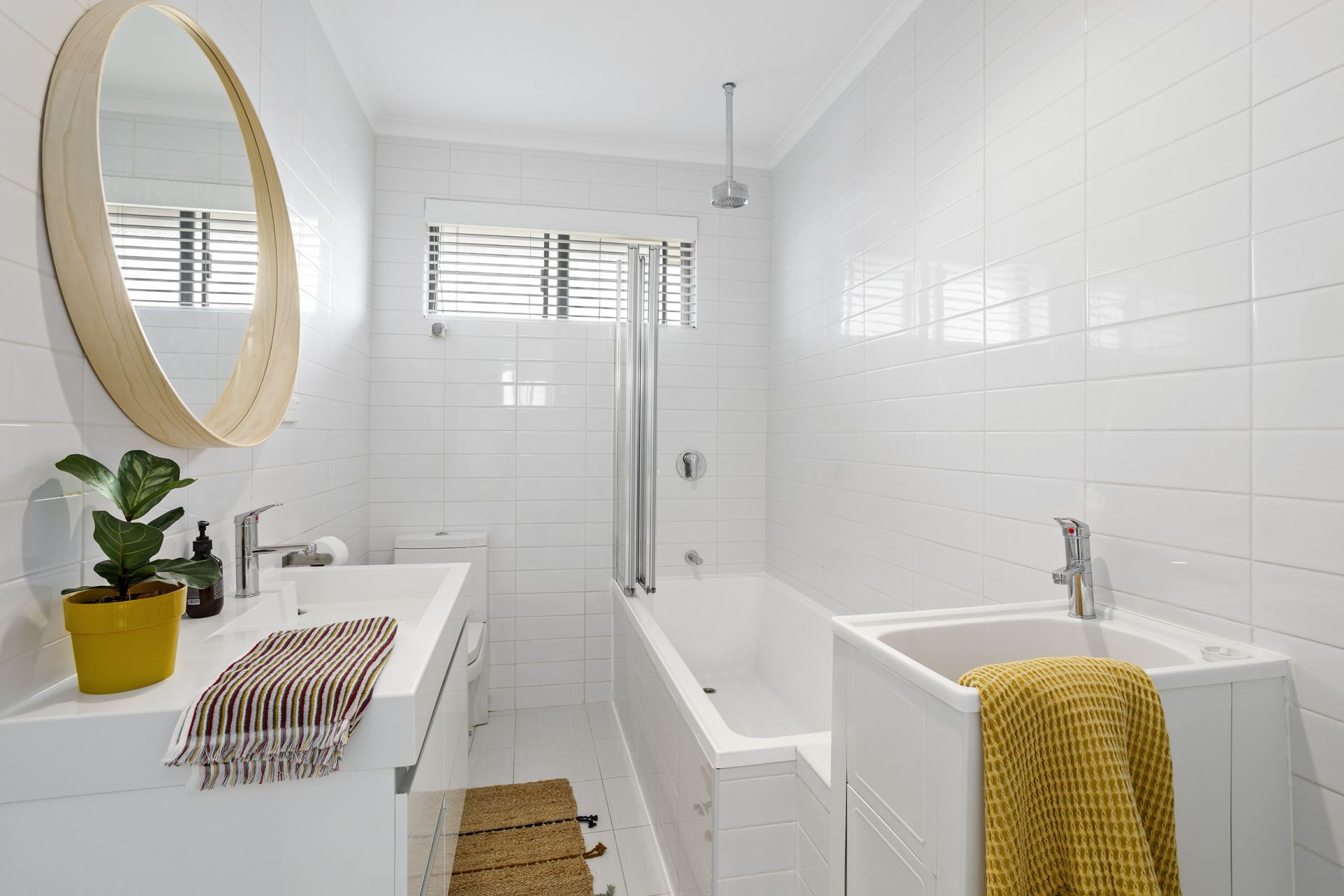 A refreshing sunlit interior proceeds you through a well-planned entrance hallway layout that separates a nice eat in kitchen away from a spacious living room & centres a swishly renovated bathroom that will easily meet your demands of having a deep bath tub, total privacy and laundry facilities away from the two mirrored robe bedroom retreats.
